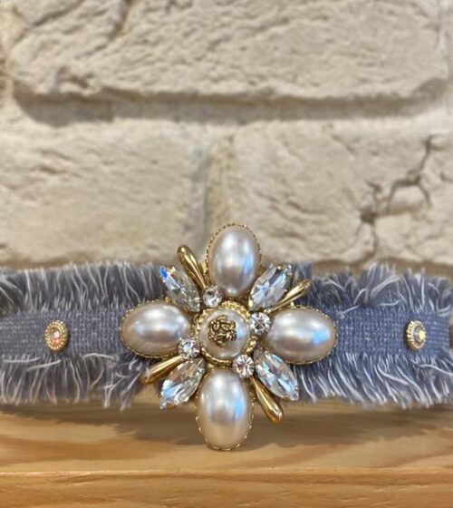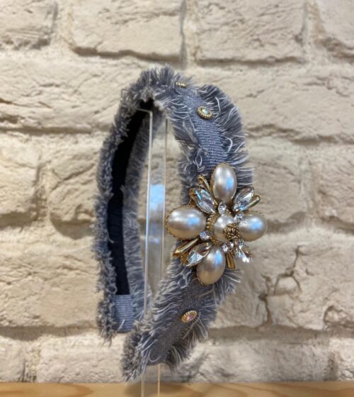 Açık Mavi Çiçek Kristal Taş İnci Detaylı Kumaş Taç