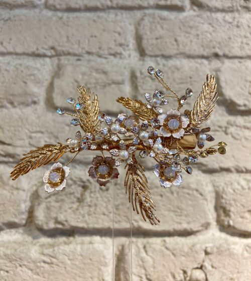 Gold Metal Çiçek Detaylı İncili Tarak Taç