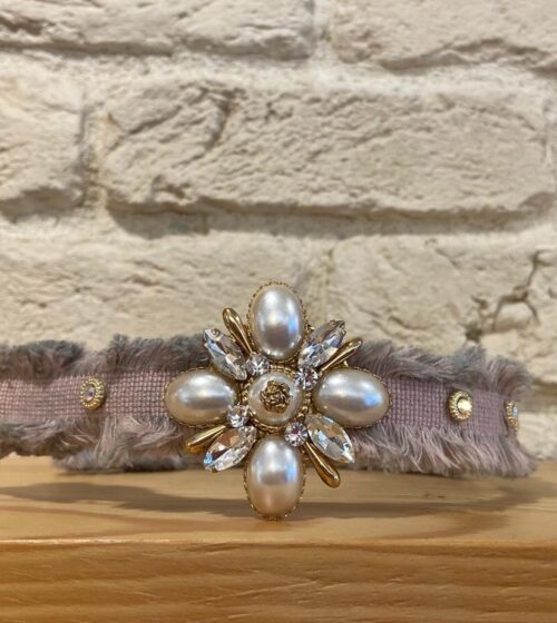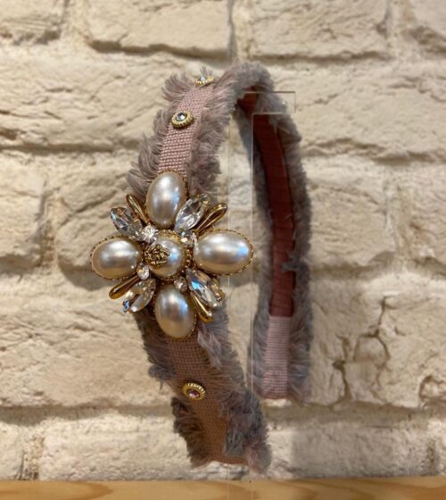 Pudra Çiçek Kristal Taş İnci Detaylı Kumaş Taç