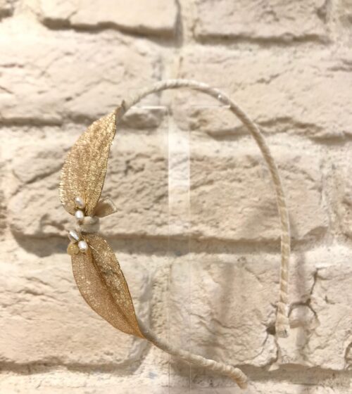 Gold Yaprak Gerçek İncili Bej Kurdela Detaylı Taç