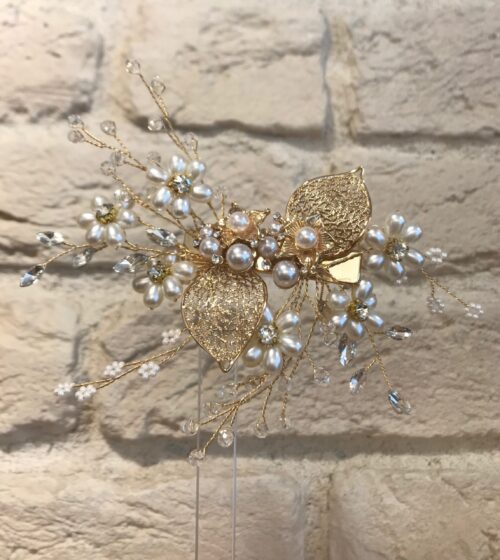 Gold Yaprak Detaylı İnci ve Kristal Taşlı Tarak Saç Aksesuarı