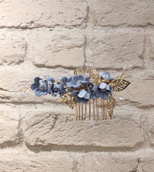 Mavi Çiçek İncili ve Taş Detaylı Tarak