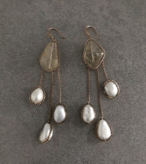 Sallantılı Üçlü Gerçek İnci Ve Doğal Taşlı Küpe
